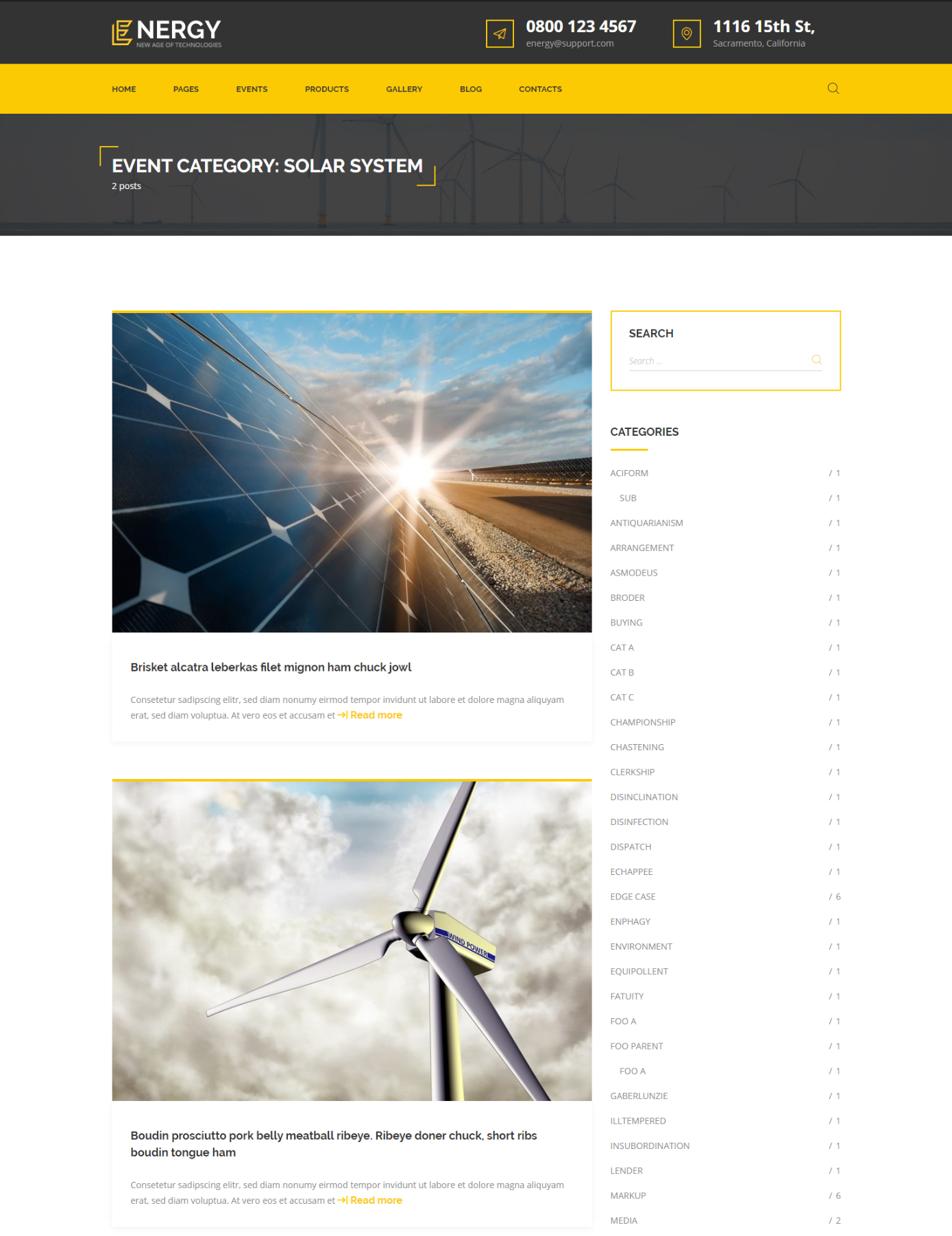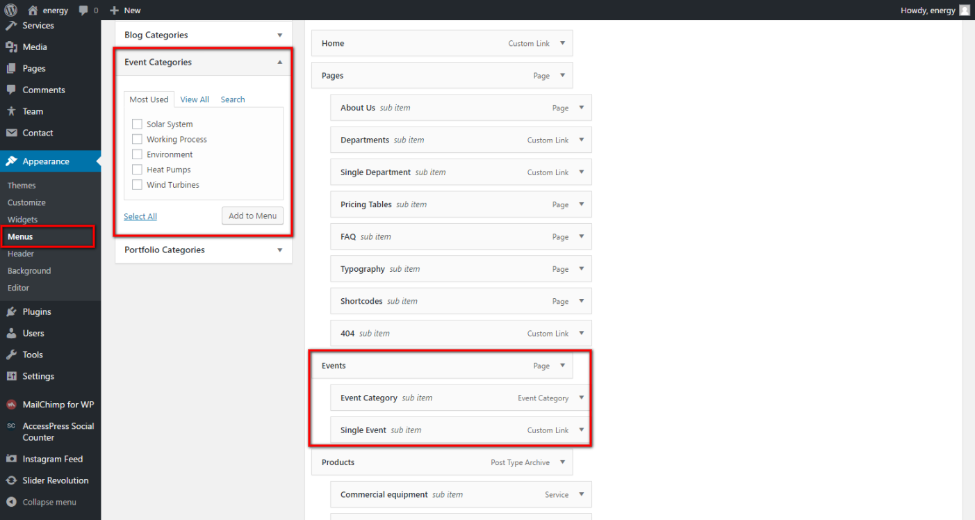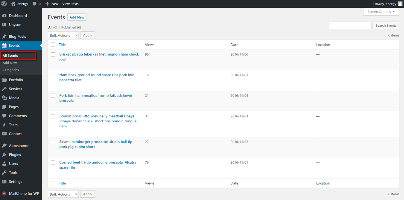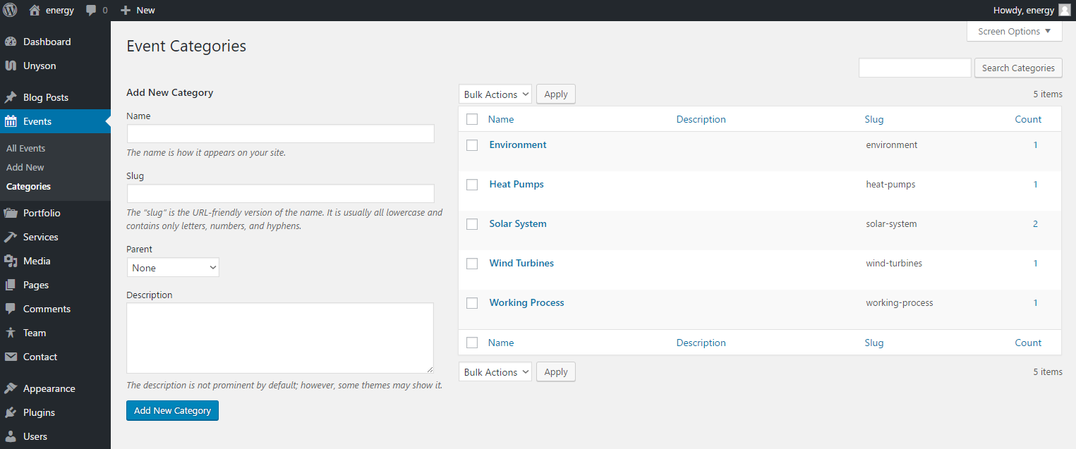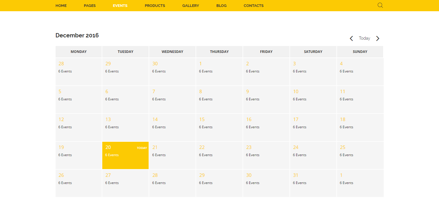 Solar Energy theme has very useful feature: Events. With the help of this Unyson extension you can add a fully fledged Events module to your theme. It comes with built in pages that contain a calendar where events can be added.