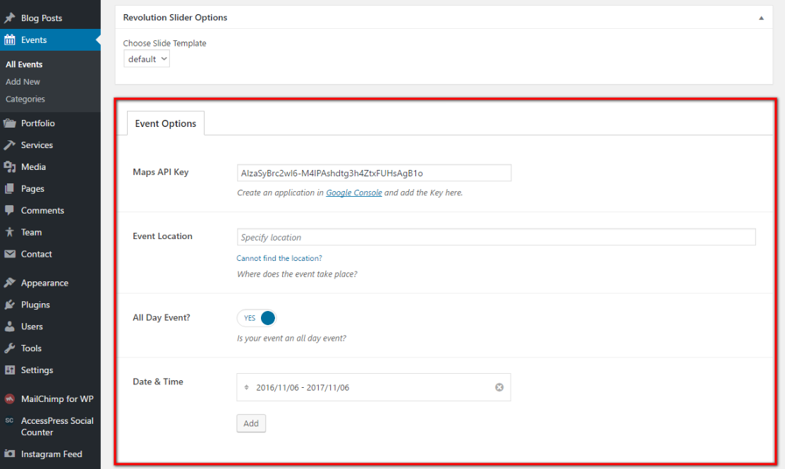 For every Event available additional settings. Click any Event and you will see them. Please note, that you need your own Google Maps API Key in order to specify the exact place and location for event.