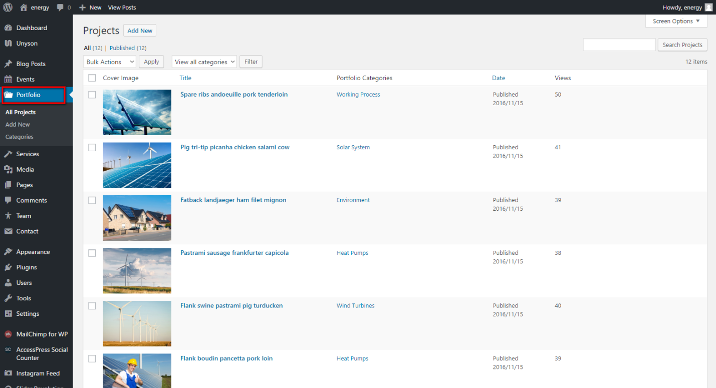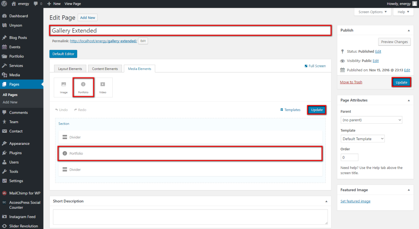 After selecting all the necessary options for Portfolio you may update it and then choose it via Unyson Drag & Drop Page Builder for any page as Widget: