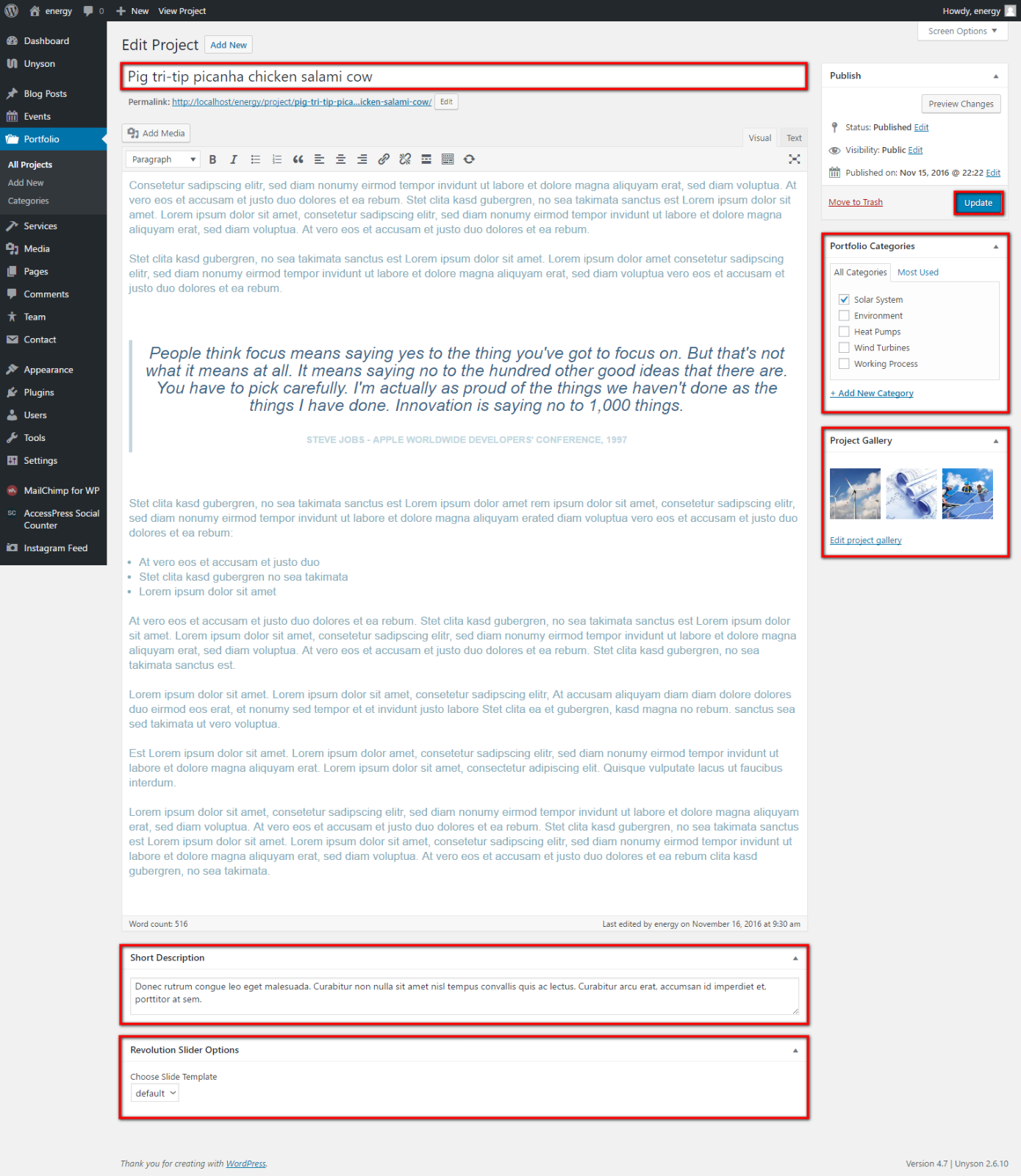 In order to customize your Portfolio, please go in your WP Dashboard => Portfolio => All projects: