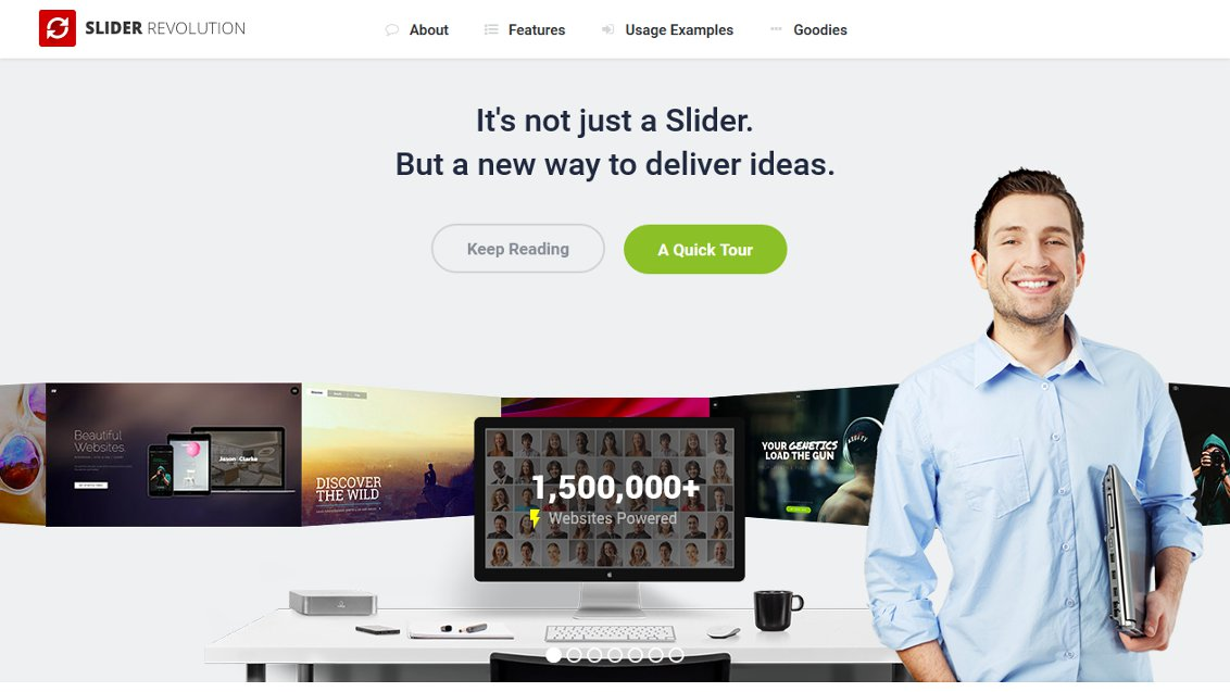 Front Page Designer. Slider Revolution is not only for "Sliders". You can now build a beautiful one-page web presence with absolutely no coding knowledge required. To get you started fast, we included a ton of premade examples that come with all assets included!