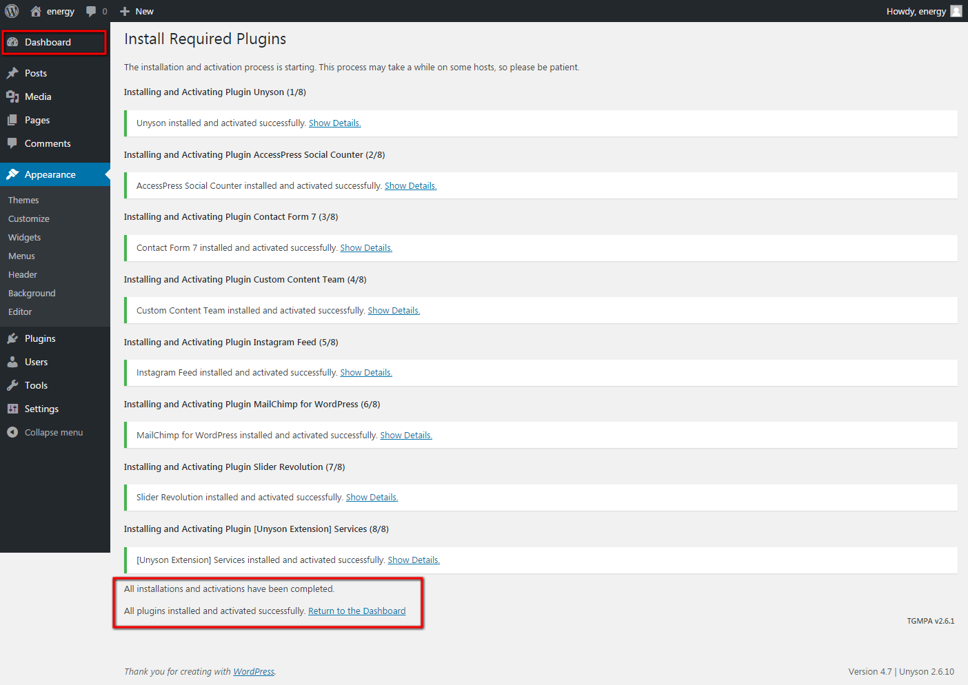 7. After installation of all plugins is finished, click "Return to the Dashboard":