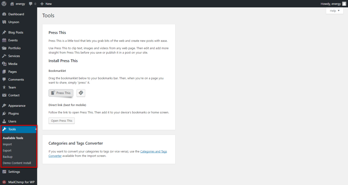 8. After installation of all plugins and extensions is finished, click WP Dashboard and refresh the page in your browser (F5) several times and you will view Demo Content Install button in Tools.