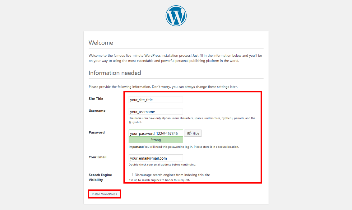 11. Fill necessary information like on the screenshot below. Click "Install WordPress":