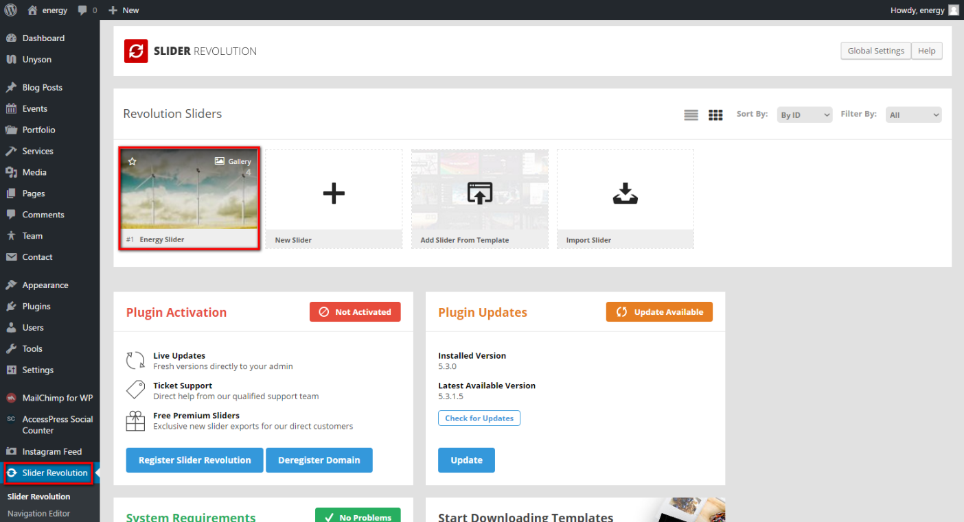 To prepare Slider for your theme, please go in your WP Dashboard => Appearance => Slider Revolution: